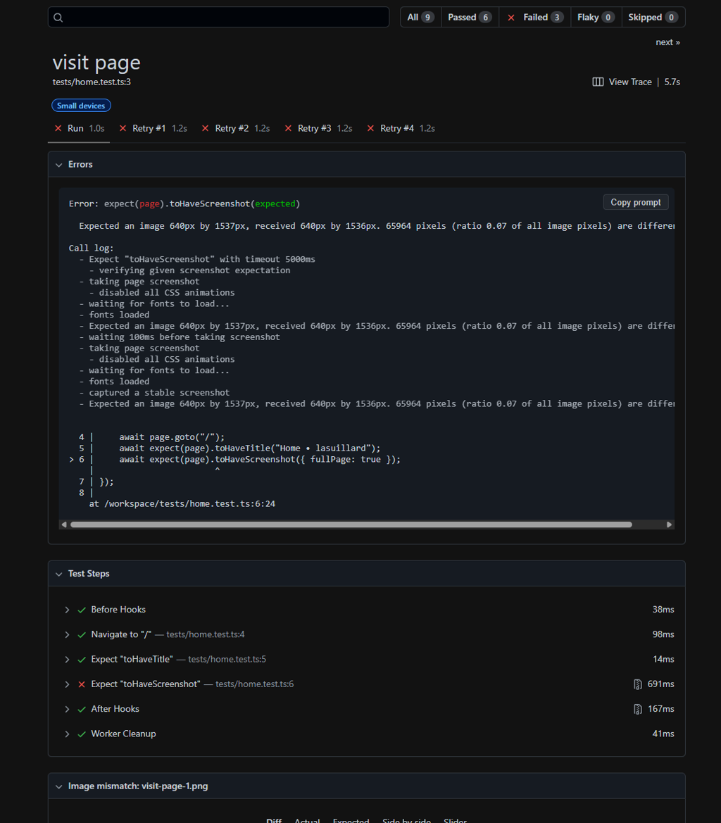 실패한 테스트 케이스의 경우 Playwright 설정에 따라 트레이스, 스크린샷 스냅샷의 변경 상세 등이 테스트 결과 상세에 포함되어 자세한 내용을 확인할 수 있습니다.
